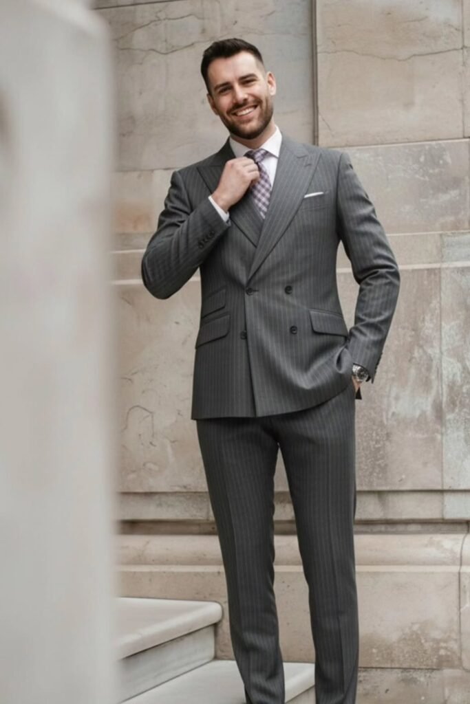 You can wear a grey pinstripe double-breasted suit with a patterned tie to add personality without losing formality.