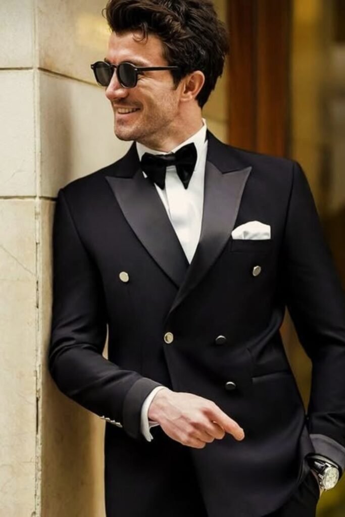You’ll feel instantly polished in a black suit with satin lapels, a white shirt, and a bow tie.