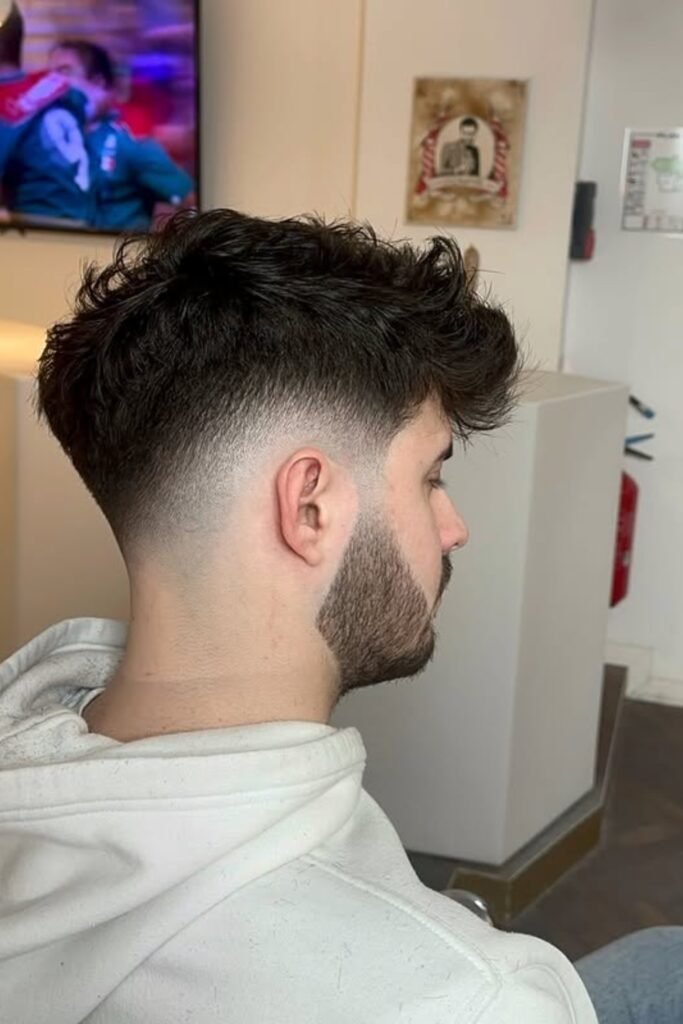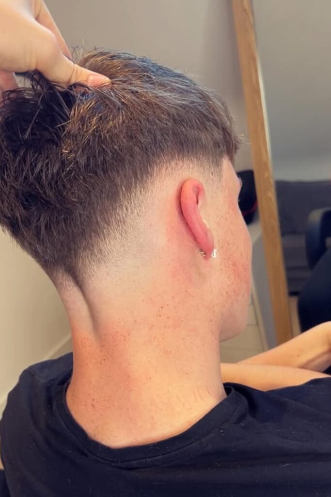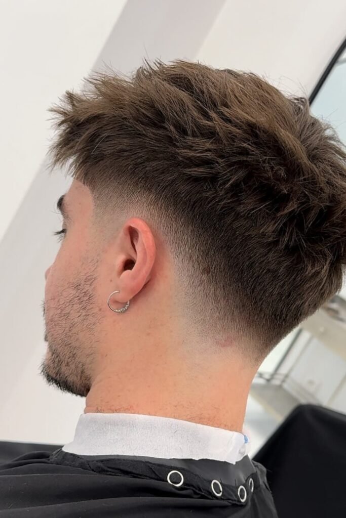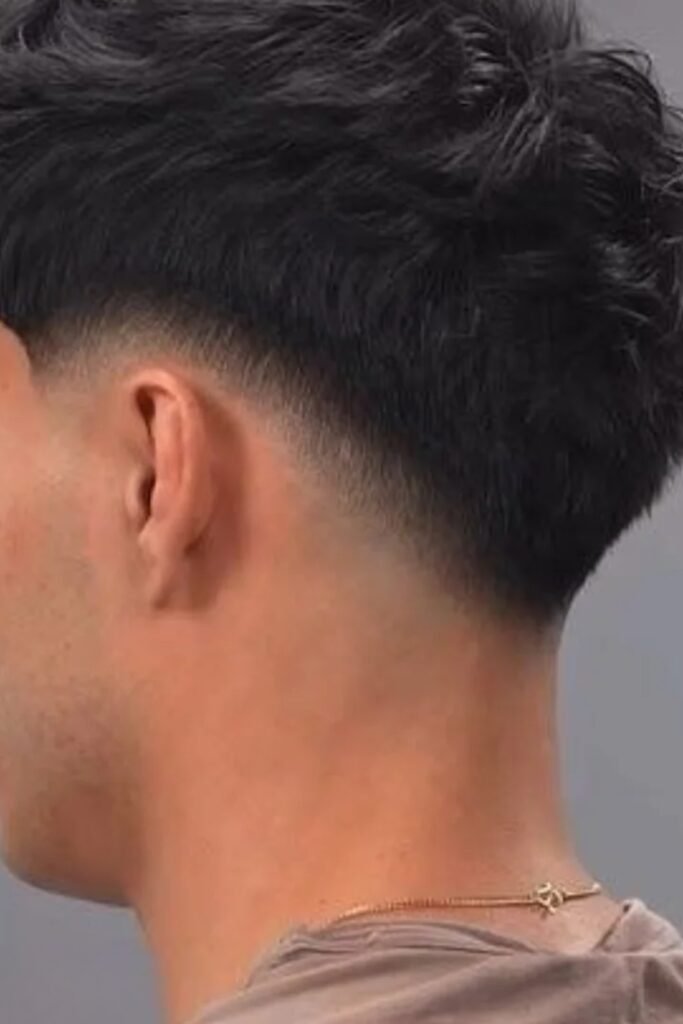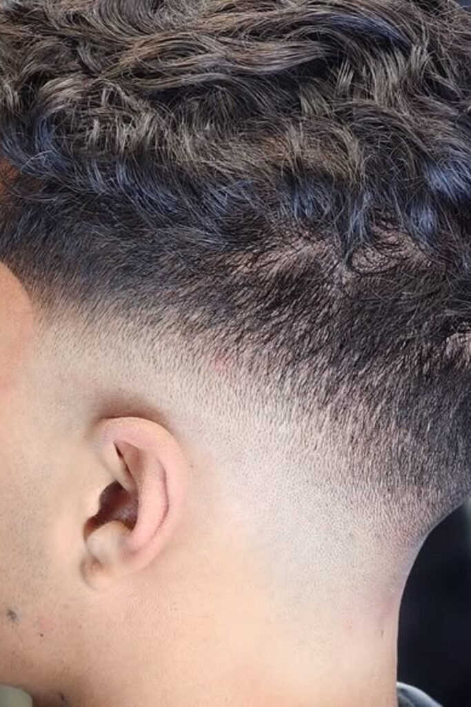 A drop fade means the fade doesn’t just run straight around your head. Instead, it drops lower behind your ear and follows the natural curve of your head toward the back.