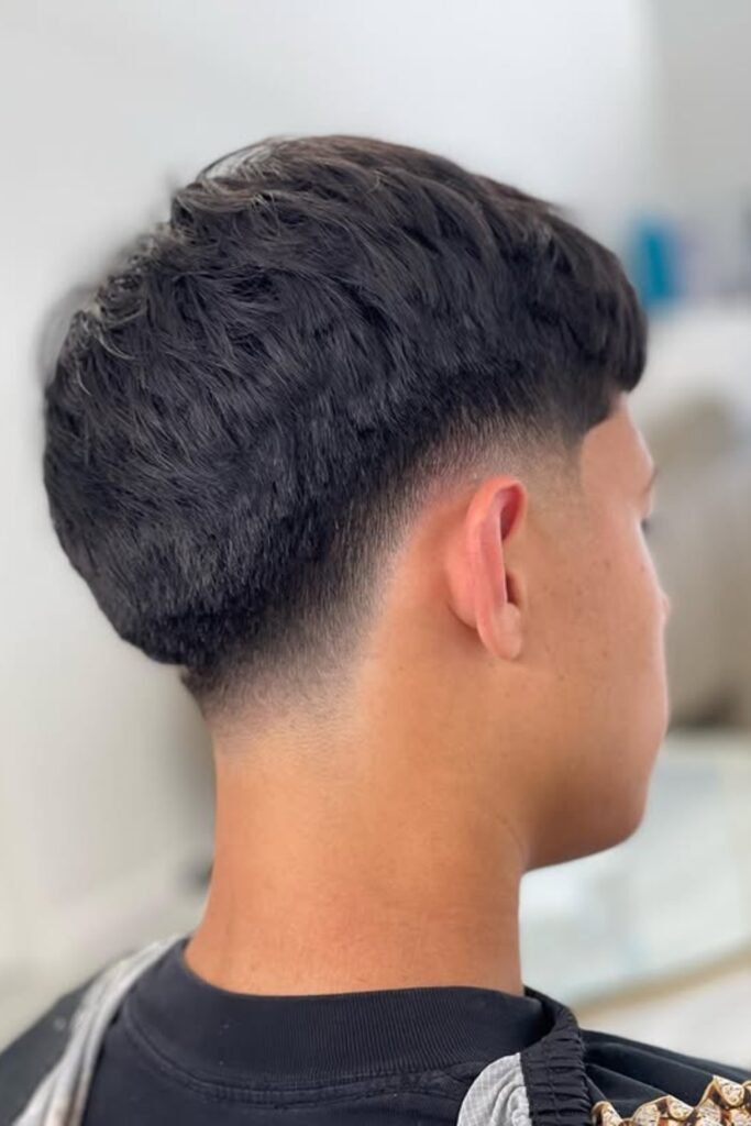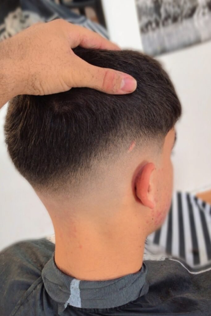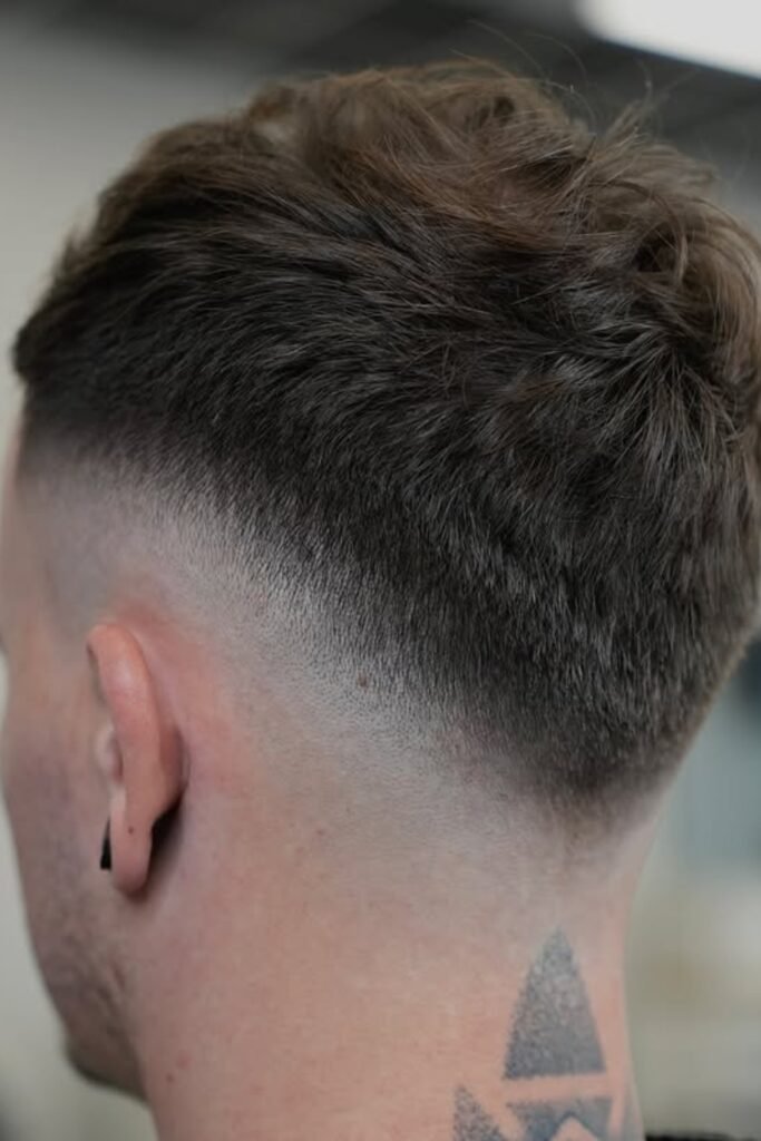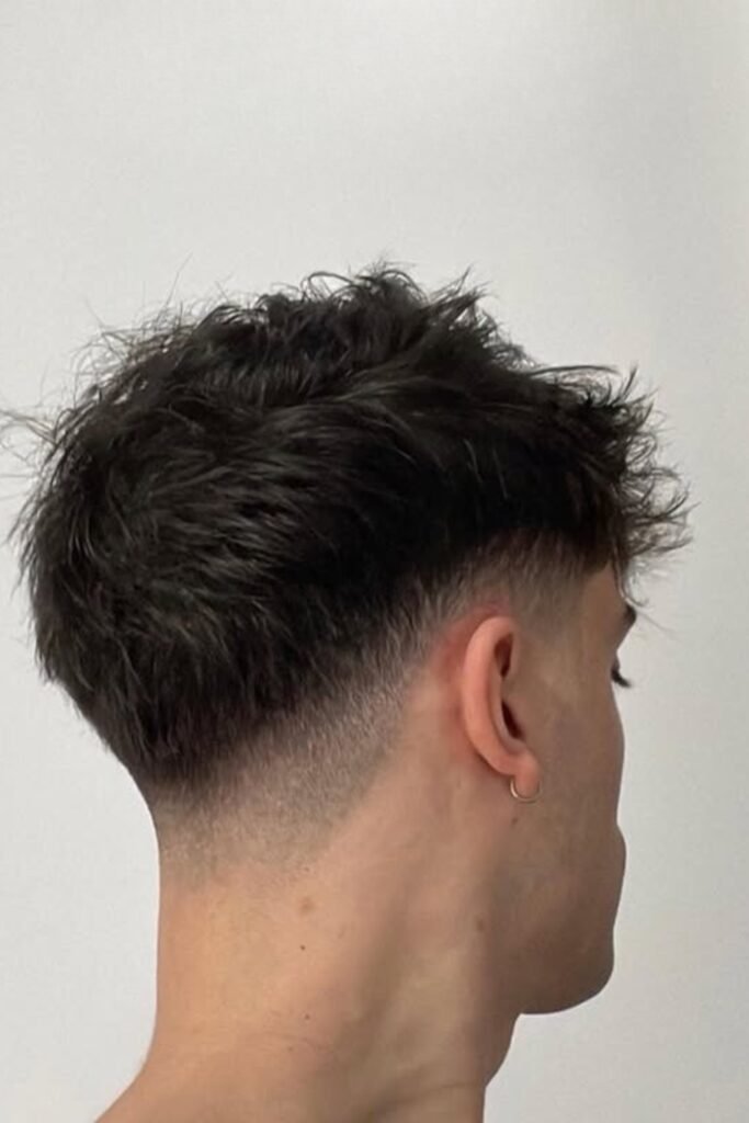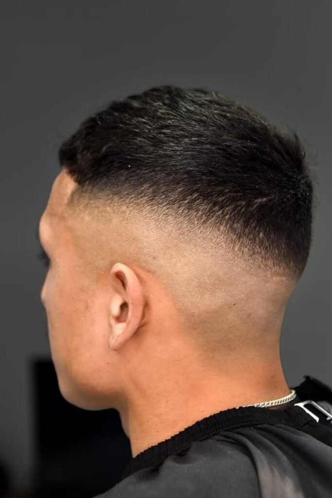 A drop fade means the fade doesn’t just run straight around your head. Instead, it drops lower behind your ear and follows the natural curve of your head toward the back.