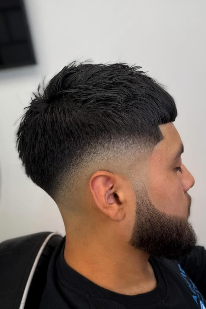If you like a bold front but still want a tidy finish, you can ask for a low drop fade with a blunt crop and a smooth blend into the beard or neckline.