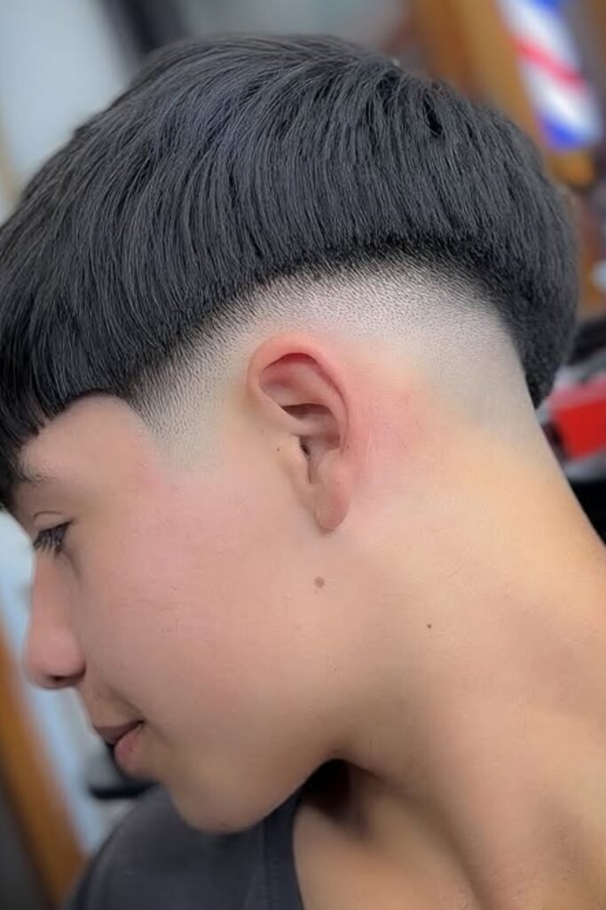 You should ask for a sharp bowl shape on top with a clean drop fade blended tight at the neck, it’ll give you that bold-but-balanced look.