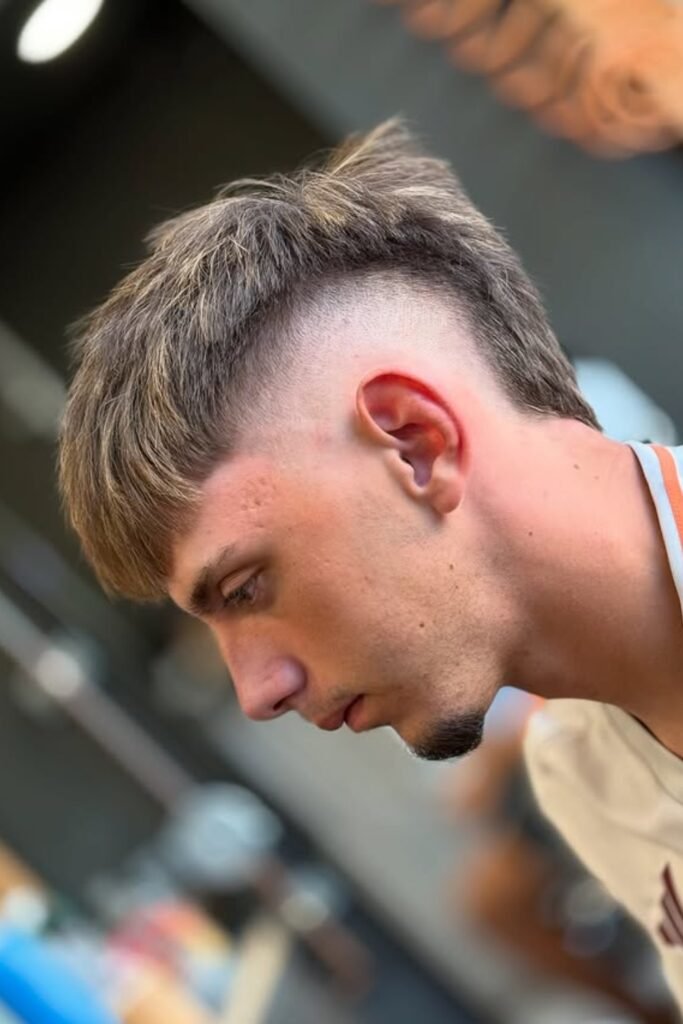 The mohawk stays subtle on top, so the focus stays on the shape. When you ask for it, you can go for a low fade with a V-shaped neckline and a soft mohawk flow.