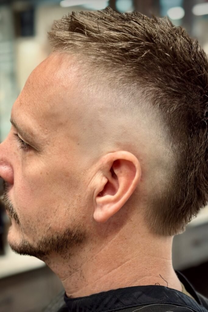 This works well if you like a slightly edgy look without daily effort. You can ask for a low-to-mid skin fade and keep the mohawk textured instead of spiked.