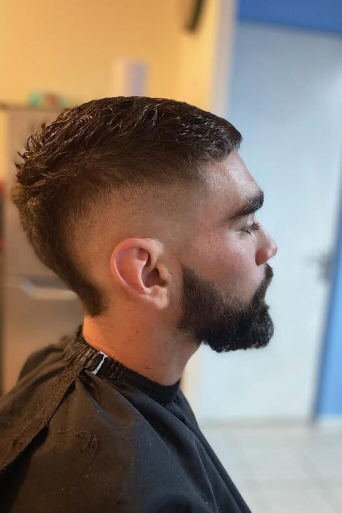 You keep the fade tight around the sides and temples, which sharpens the shape, while the top stays short and textured for easy control.