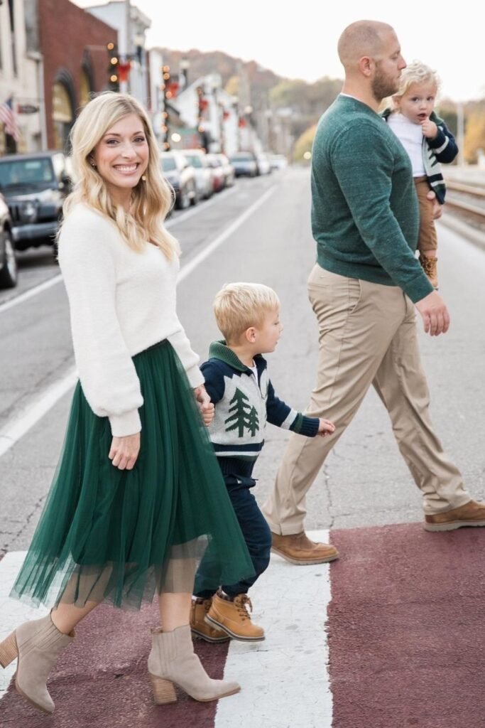 A pop of green, a tulle skirt or cozy sweater adds that cheerful holiday touch, while the kids’ themed sweaters keep things playful and heartwarming.