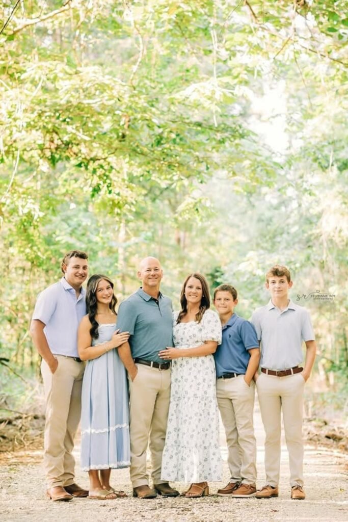You can mix soft neutrals with a touch of floral for texture and charm like a floral dress for mom and button-up shirts for the boys.