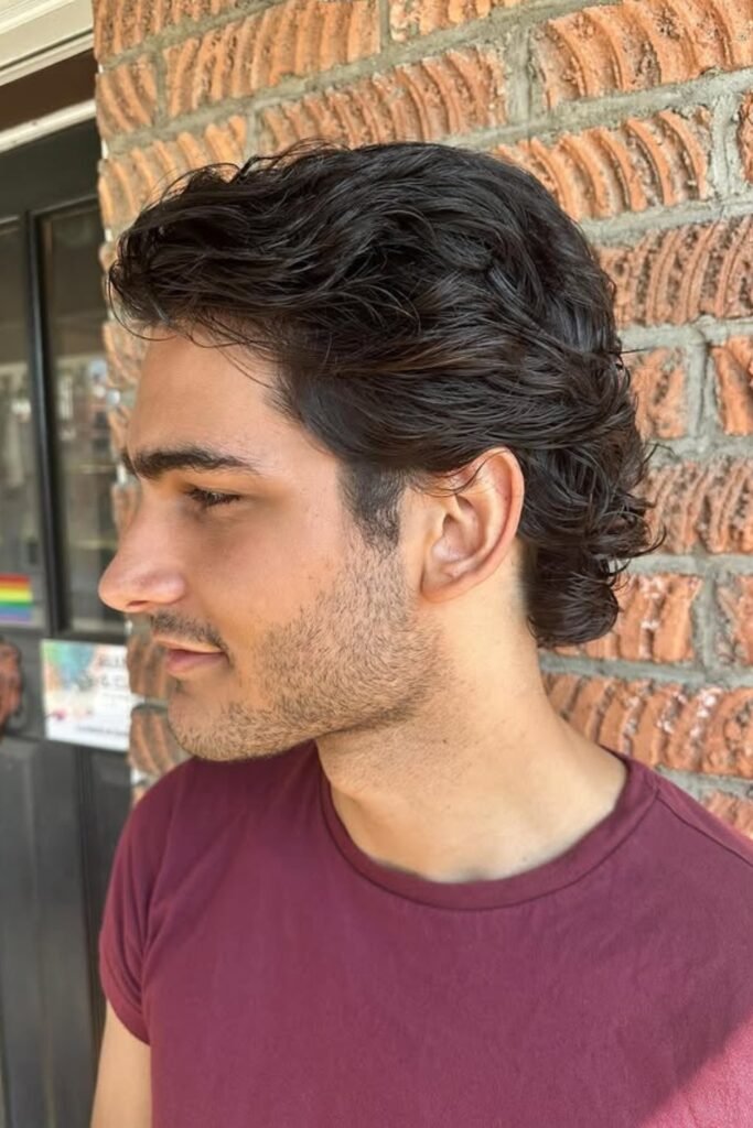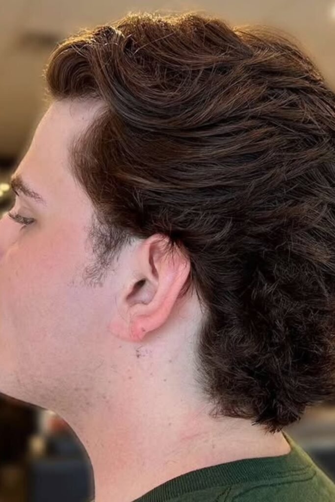 To recreate it, you should avoid short neck trims and you can ask your barber to keep the back connected, with just enough shaping so it doesn’t flip out as it grows.