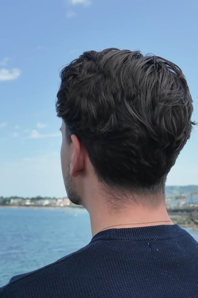 You keep the fade low and clean while the top and back stay long enough to move naturally. This works well if you want a modern look without losing that relaxed flow feel.