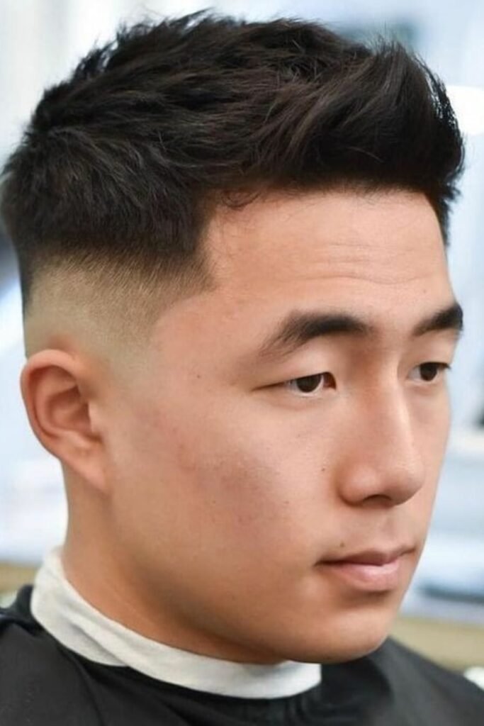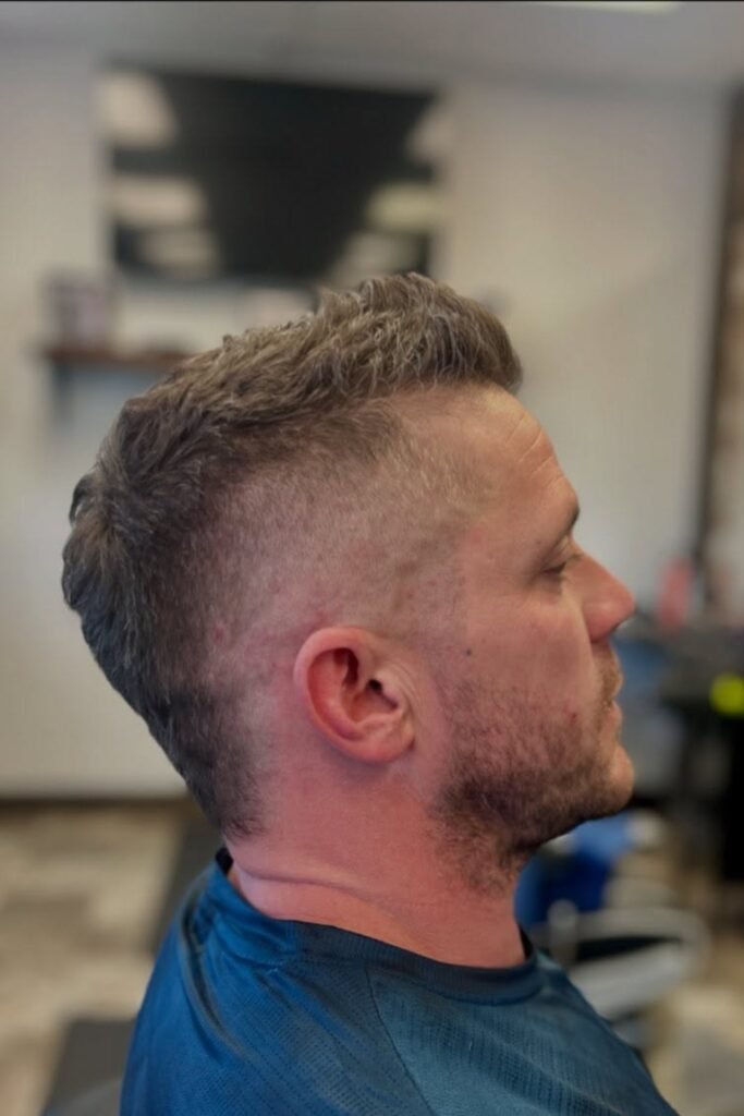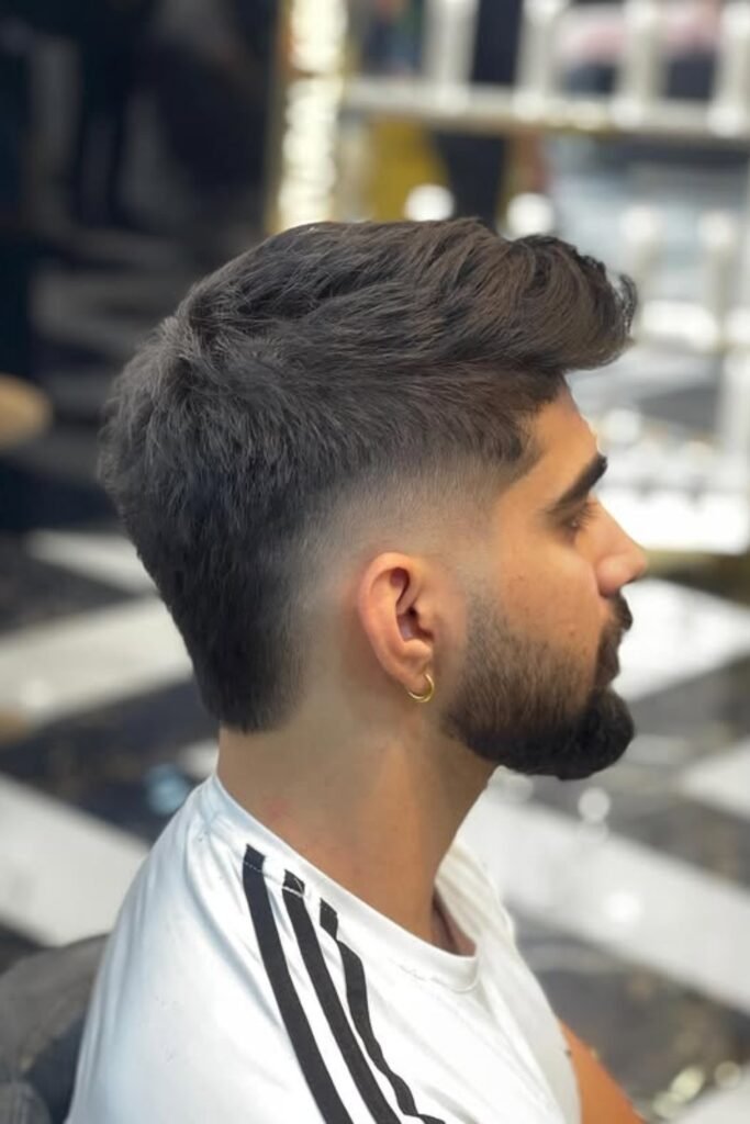 The fade makes the haircut sharp, while the textured middle adds height without pushing it into full mohawk territory.