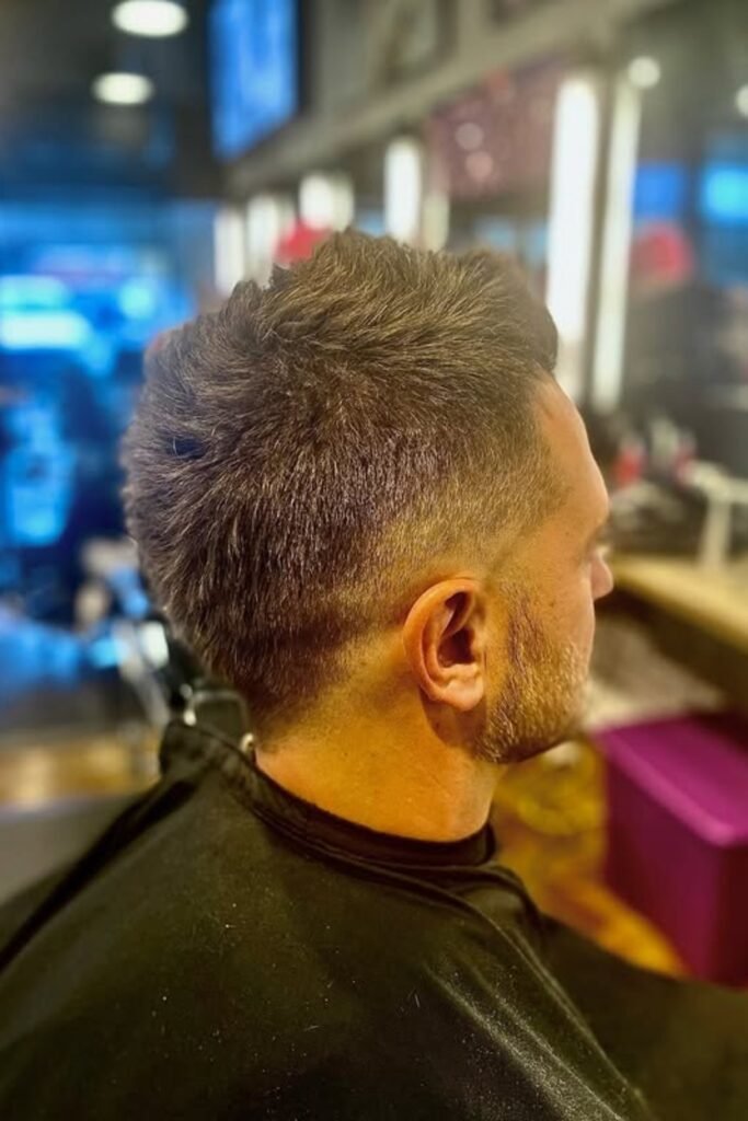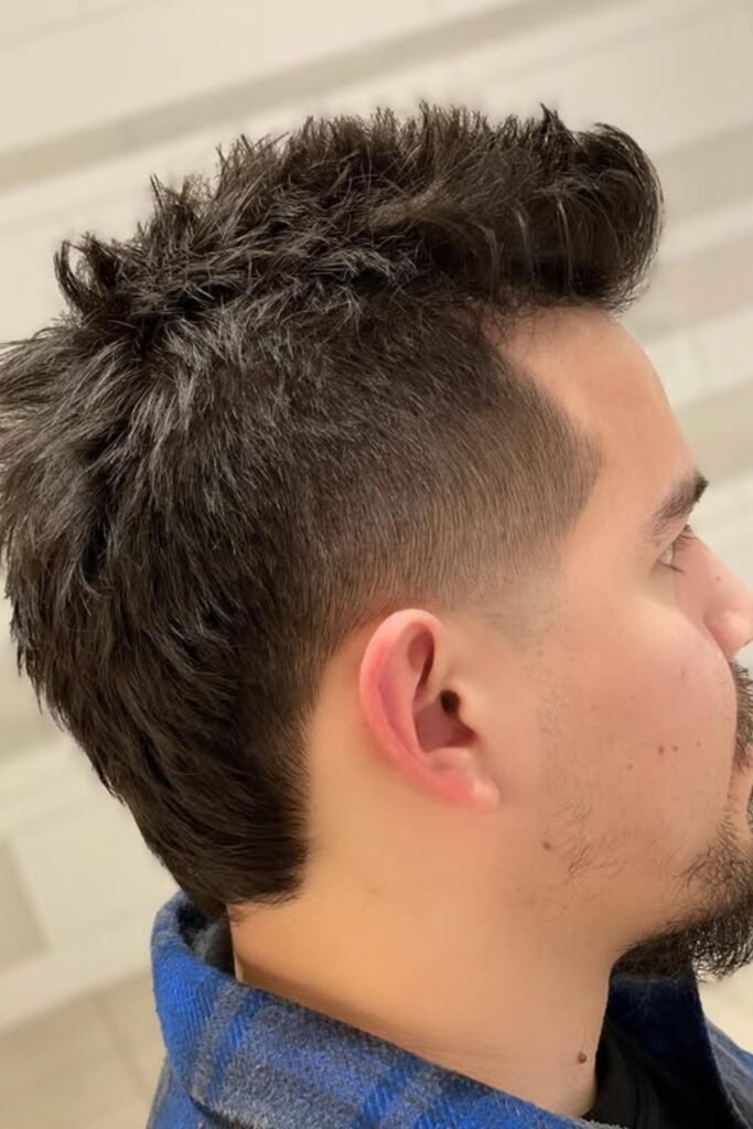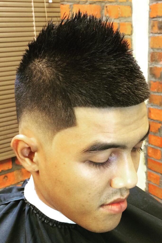 You should ask the barber to keep the top short and stiff enough to spike easily, request a clean high fade, and make sure the center line stays straight so it doesn’t drift into a full mohawk.