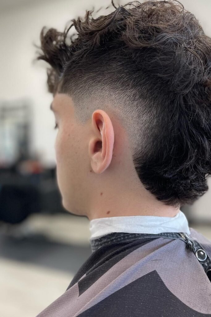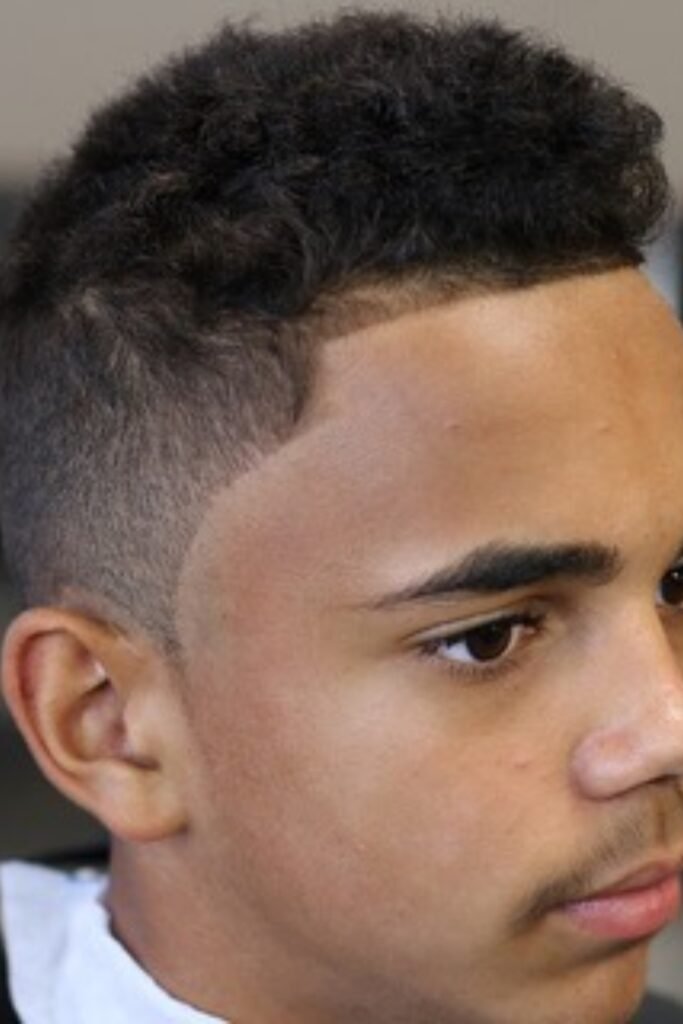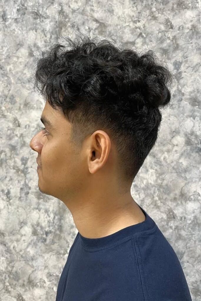 You should ask the barber to keep the middle long enough for curls to form naturally and shave the sides clean, making sure the blend stays smooth so the focus stays on top.