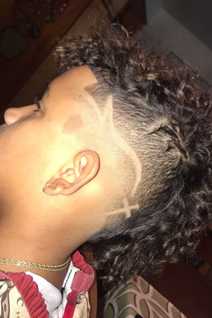 You should ask the barber to keep the curls full on top, fade the sides clean, and add a simple design that follows the head shape instead of overpowering it.