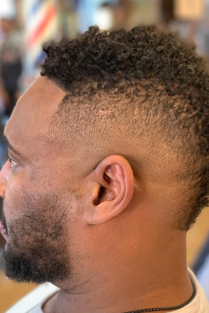 You can make texture the star of this fohawk instead of length. When you let tight curls run through the center, you give the haircut its shape, while shaved sides remove distraction.
