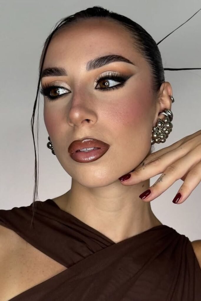 You might try warm caramel tones for a smooth, sculpted finish, pairing a brown-nude liner with a creamy nude gloss.