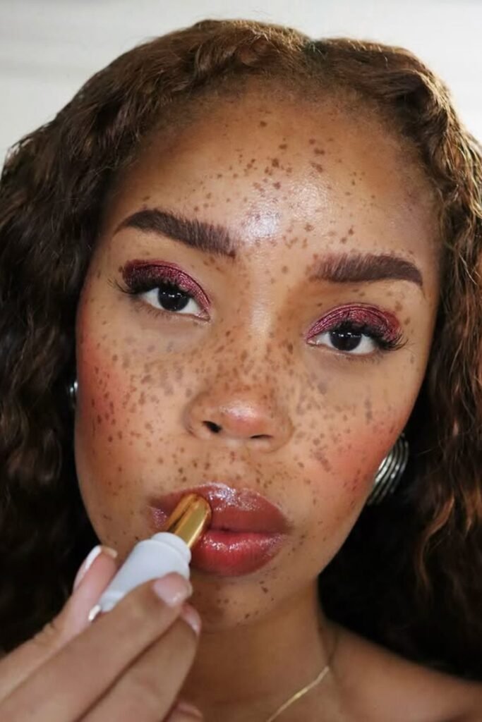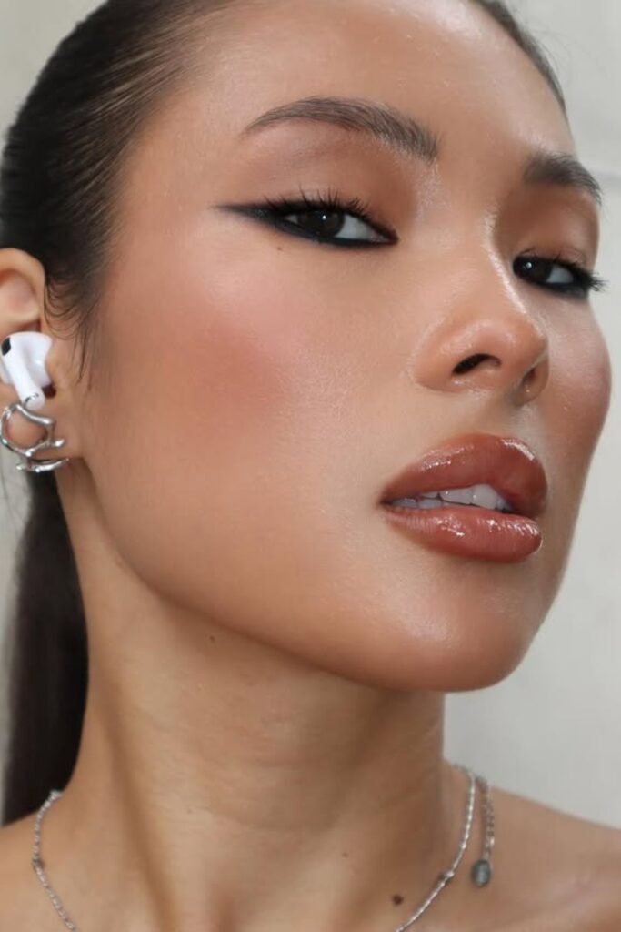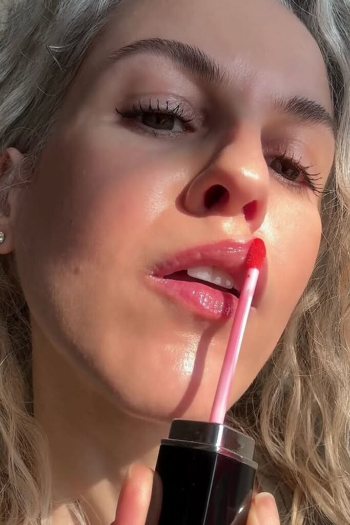 You are aiming for a smooth, hydrated finish that makes you look fresh and juicy. You can use gloss, lip oil, or even a glossy balm to get this effect.