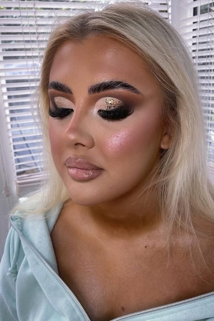 You’ll notice darker outer corners frame your eye, making the glitter look controlled.