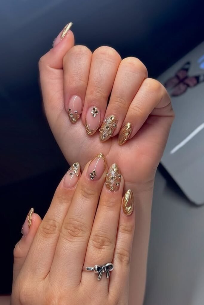 You want nails that feel like jewelry? You can mix full gold chrome with glitter-packed accents, and clear base keeps things fresh while crystals catch every bit of light.