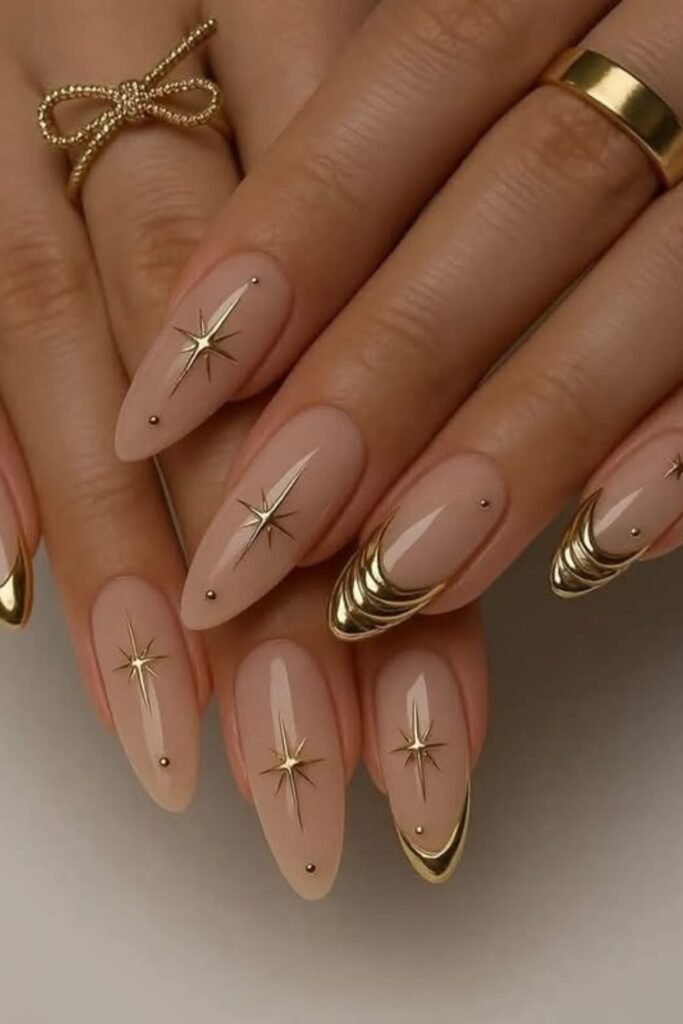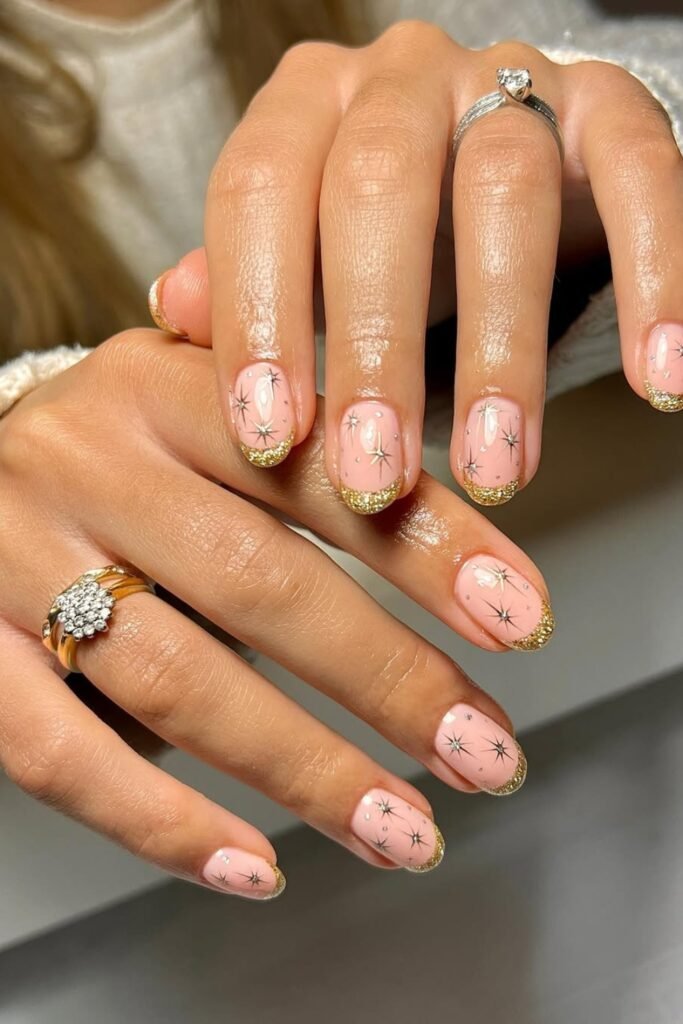If you want playful elegance, you can mix tiny silver stars with fine gold glitter tips.