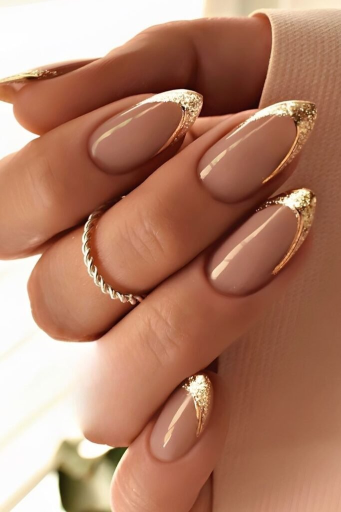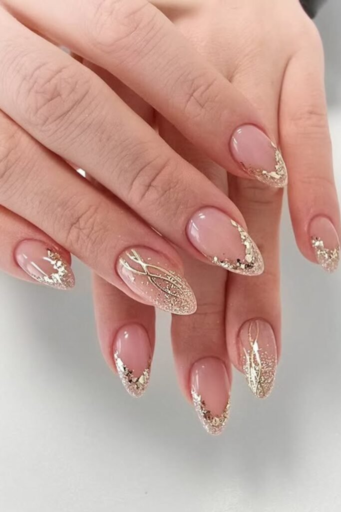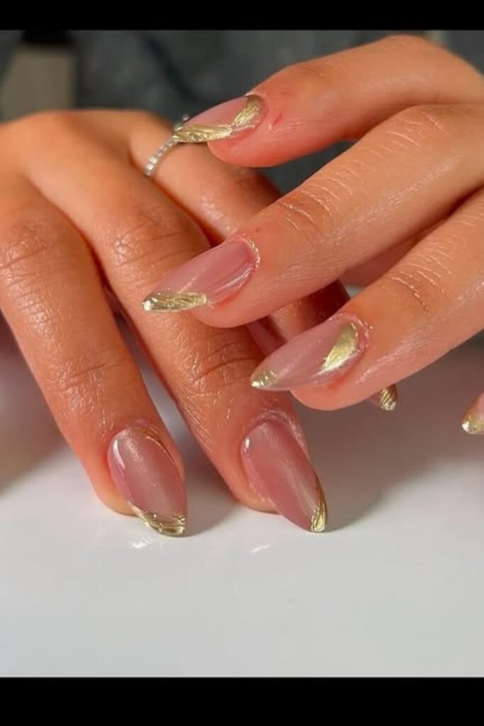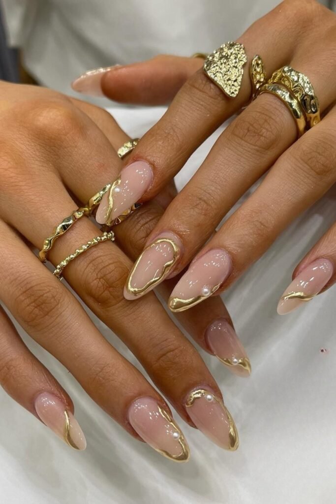 You can try nude nails with irregular gold edges. You wil see the freehand gold lines at the tips create a chic, artsy twist.