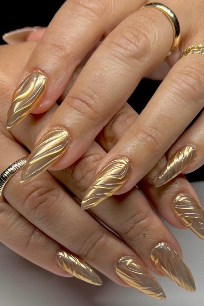 You love statement nails, sculpted raised swirls with gold chrome powder give a 3D molten-metal effect.