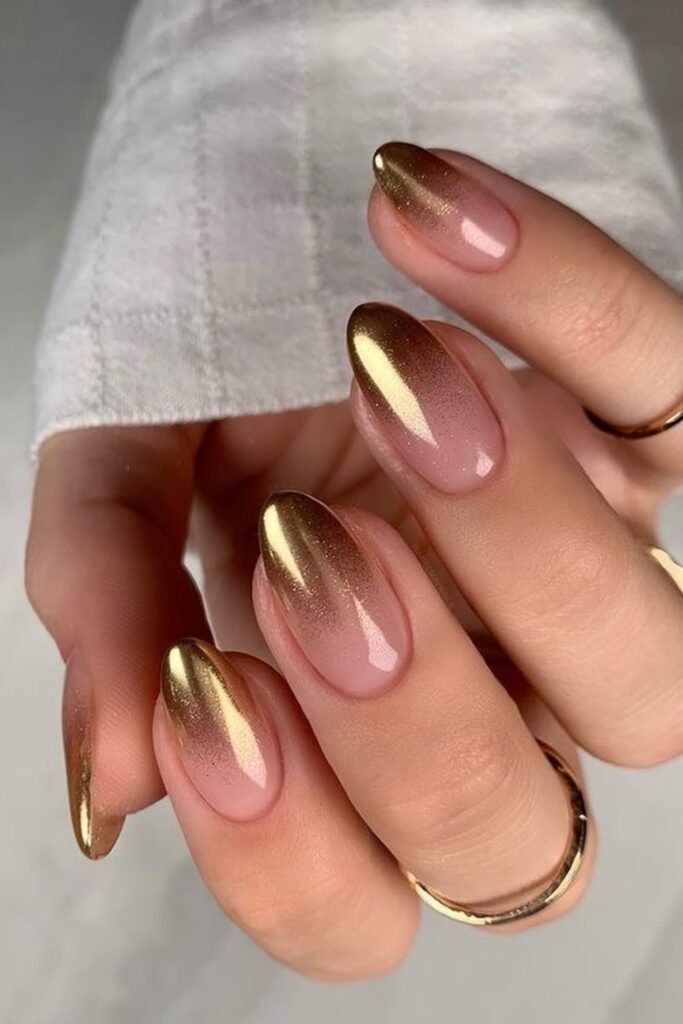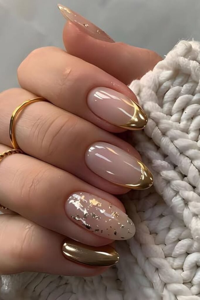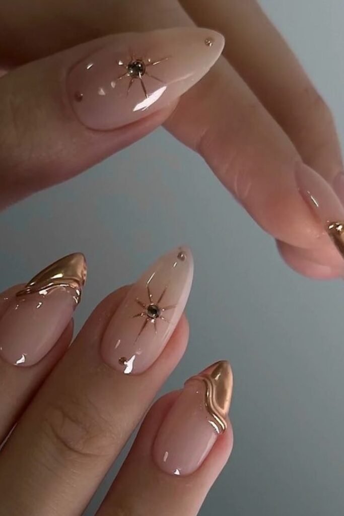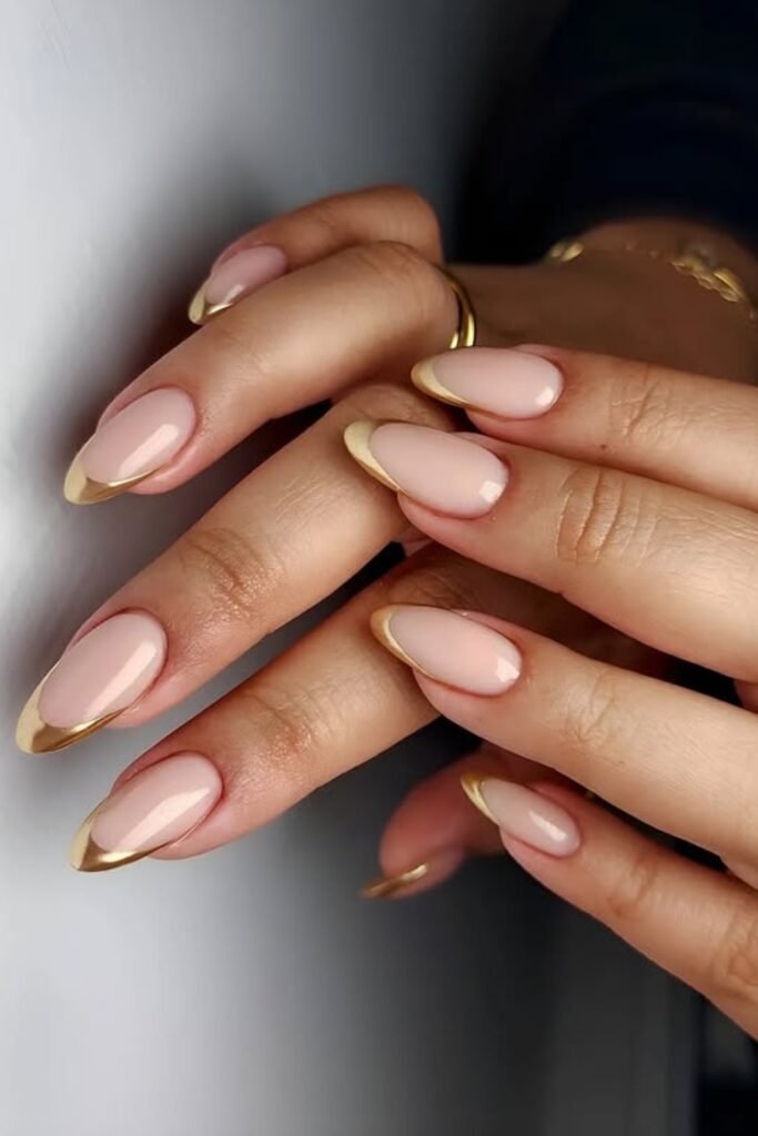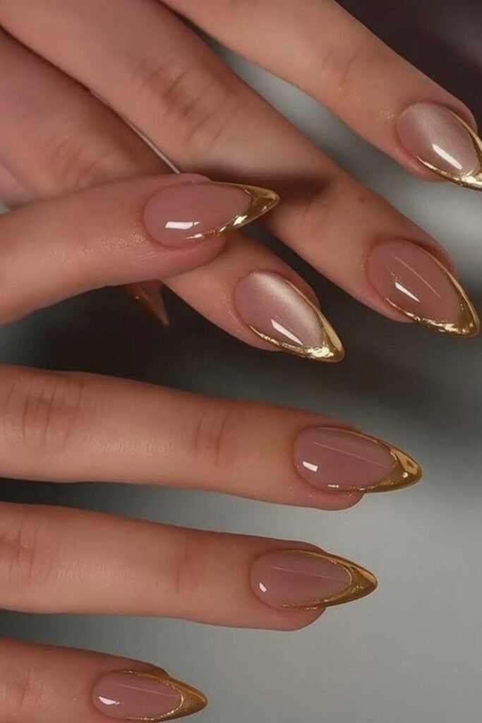 If you want your gold to feel 3D, you can try sculpted metallic edges. These frame a simple nude base like jewelry, instantly elevating your manicure.