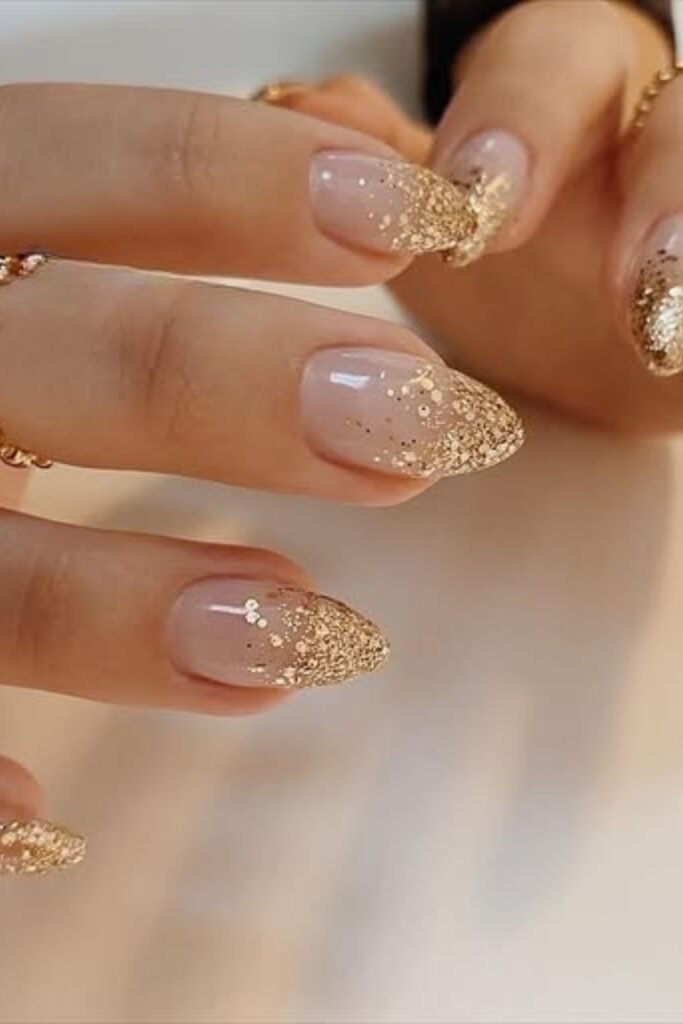 You should start by lightly dabbing gold glitter polish from the tips downward.