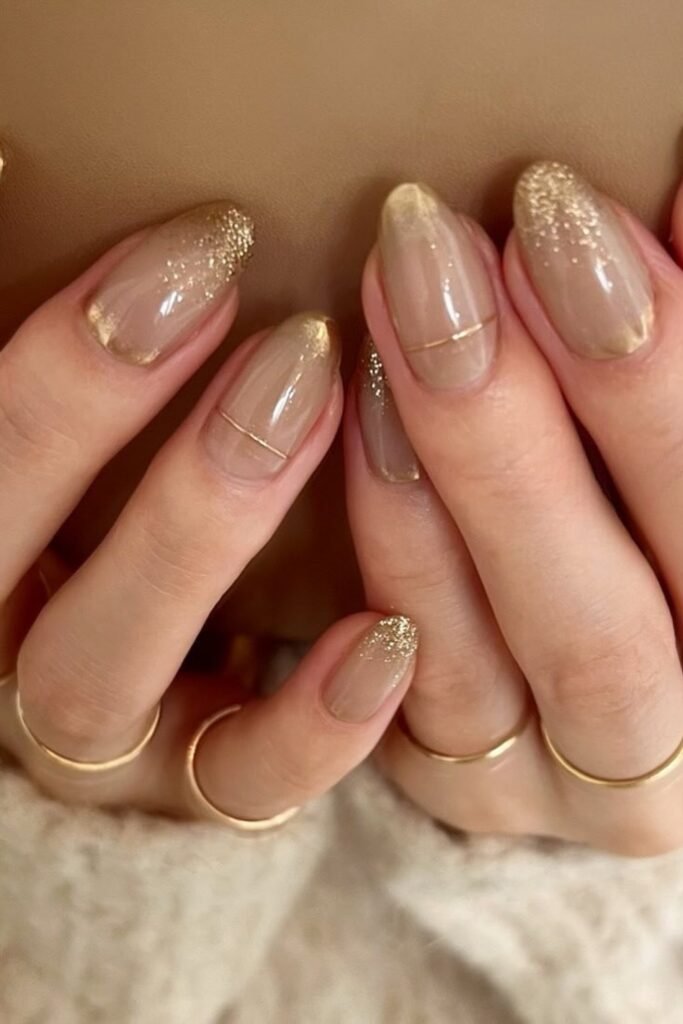 You just need a sheer nude base and a fine brush for curved gold edges, and have a polished manicure that whispers luxury instead of shouting it.