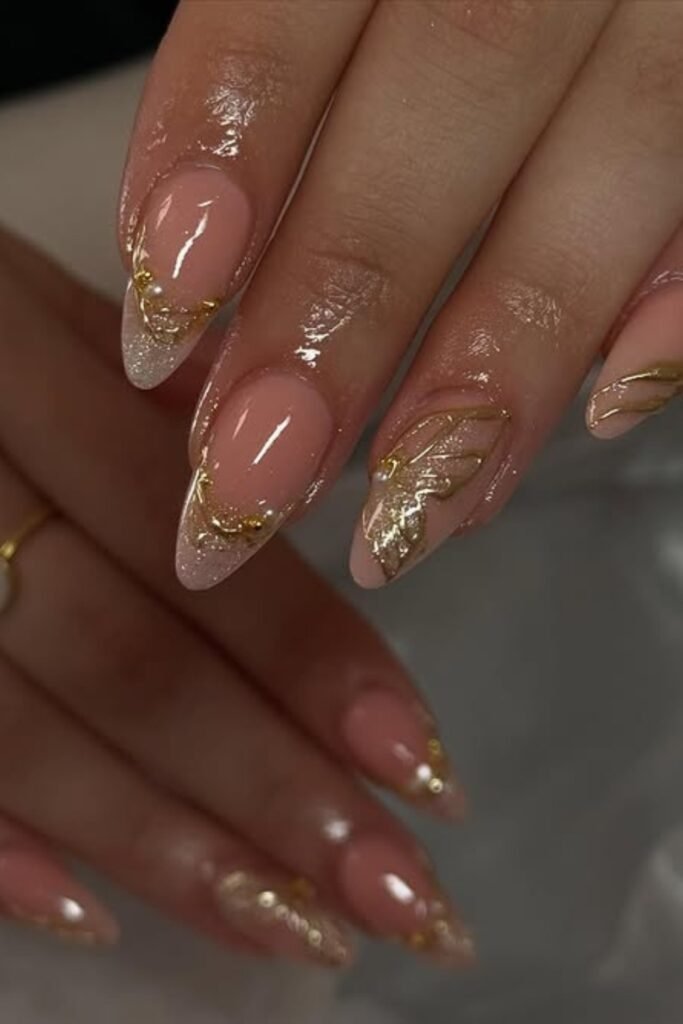 You will see thin, flowing gold lines over a nude-pink base give an airy, glowing finish.