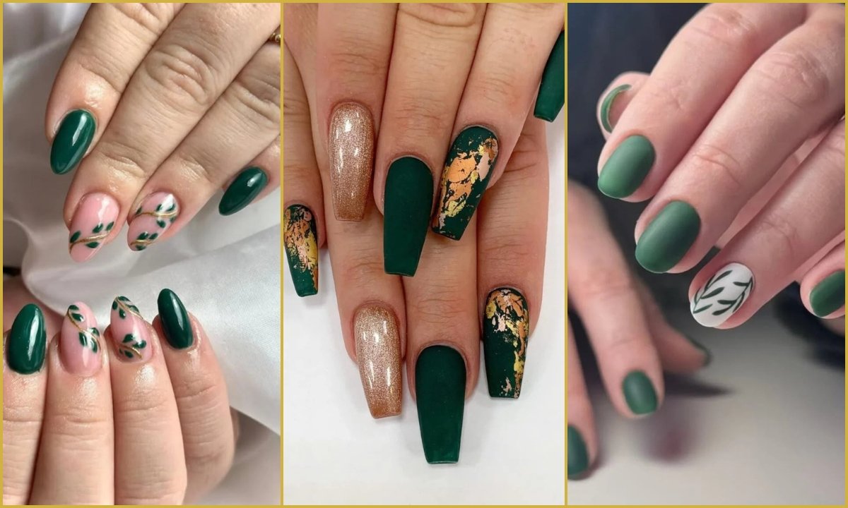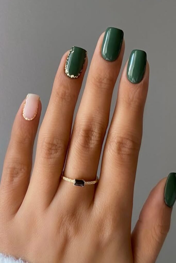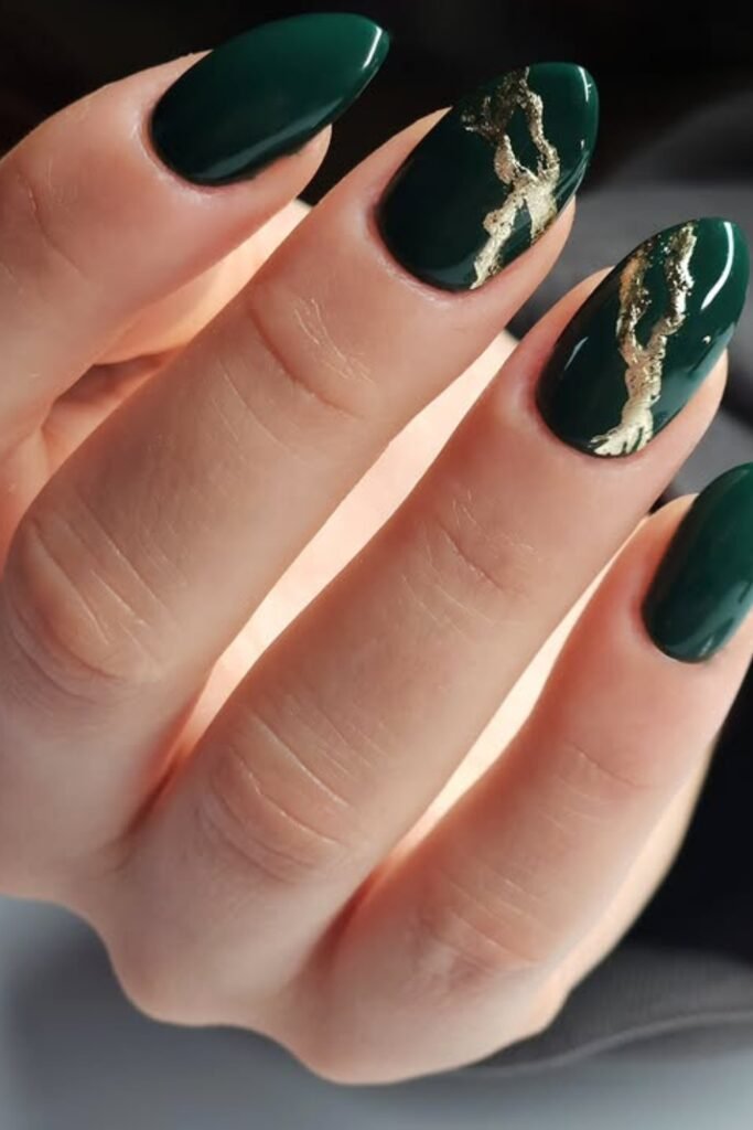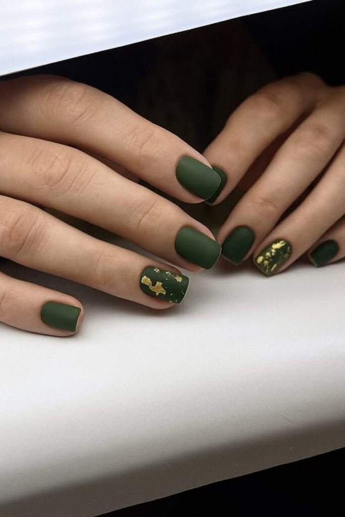You can pick matte forest green nails with gold foil accents to get a modern, luxurious vibe that works beautifully for winter or evening wear.