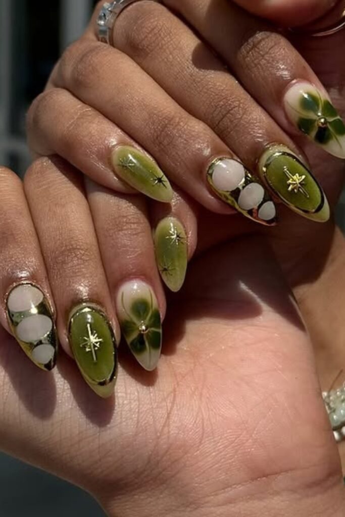 If you try olive marble nails with gold stars, you can create the perfect mix of earthy and glam.
