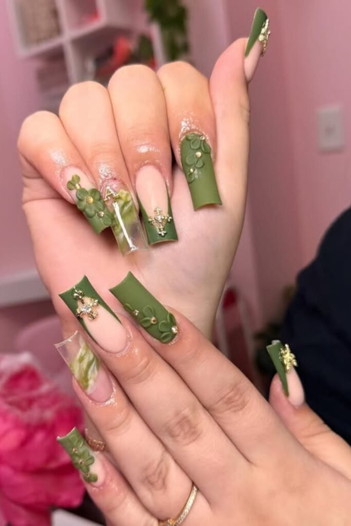 If you love textured art, you can go for olive 3D floral nails to make a bold statement.