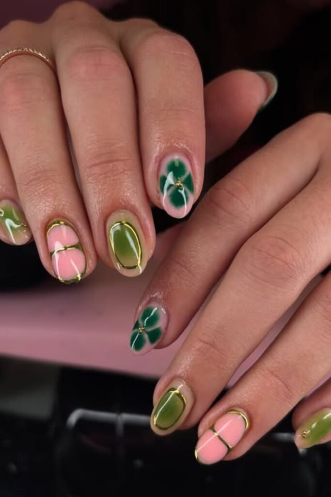 You can try a playful mix of olive, blush pink, and chrome detailing to give your nails an artistic edge.