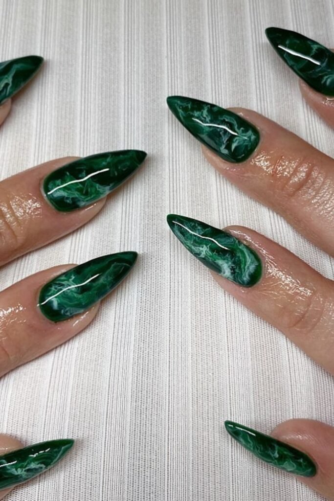To make your nails look sophisticated, you can try dark green marble art for a gemstone-like finish.