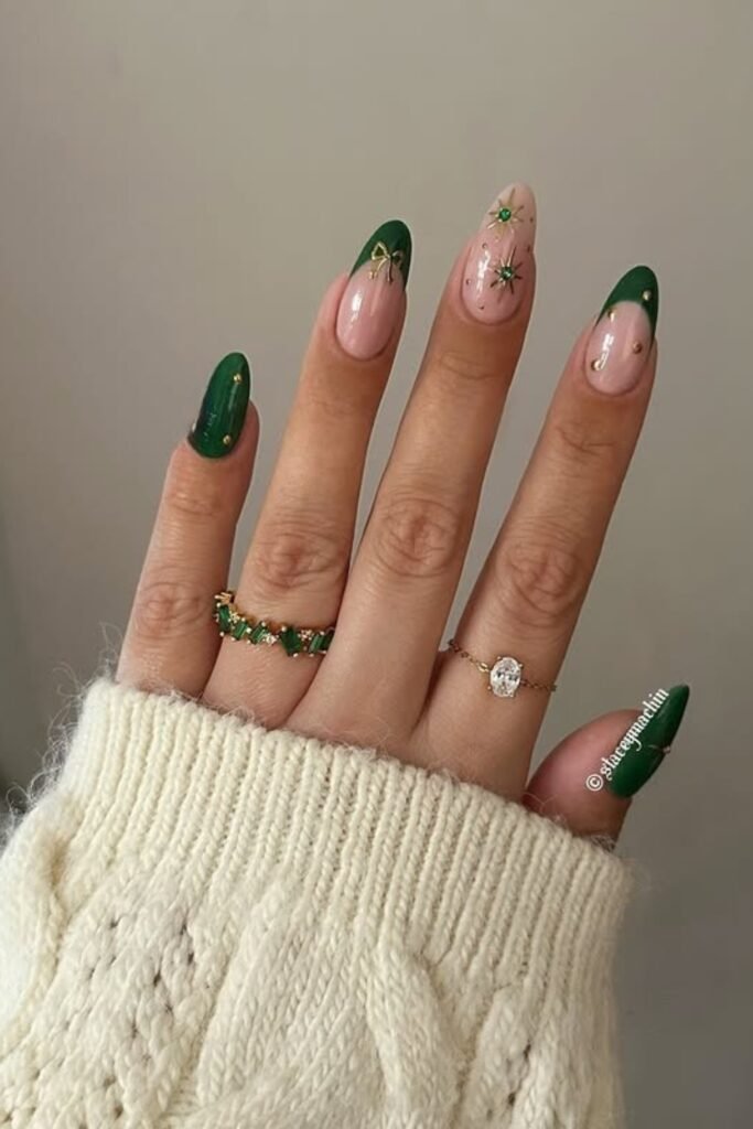 You can keep the soft nude base feminine while letting emerald tips and tiny golden stars make it festive without overdoing it.