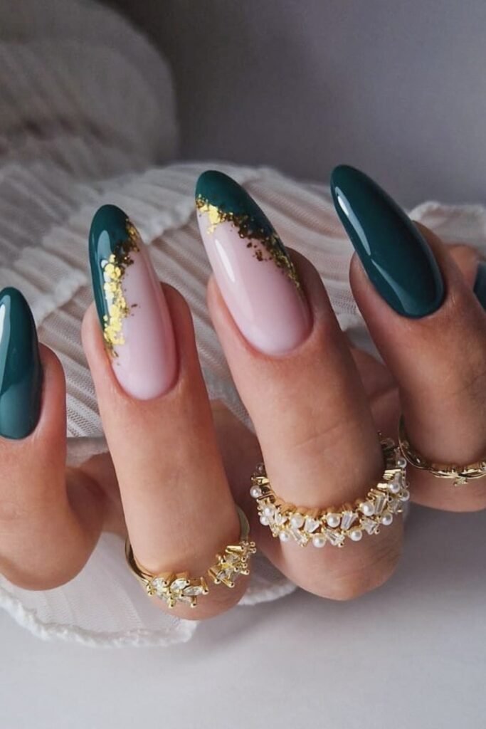 You can make emerald green nails feel refined by pairing them with nude and a hint of gold foil.