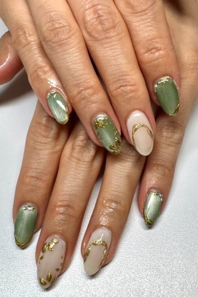 You can try soft metallic green paired with gold detailing to instantly add a luxe twist to your manicure.