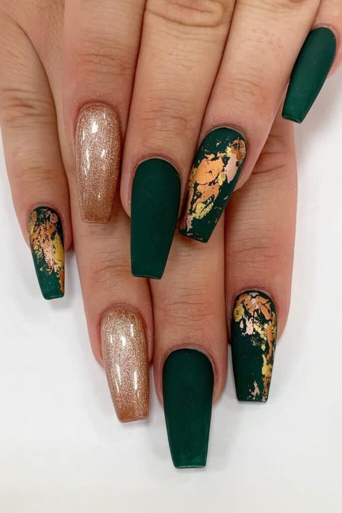 You can make deep emerald matte nails meet golden foil for a bold, modern statement.