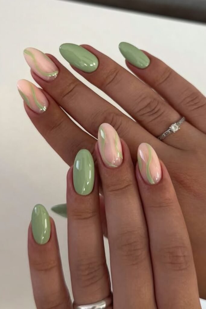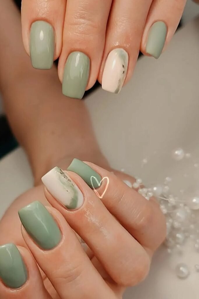You can pair the muted green with a creamy beige accent nail for a minimalist, luxurious vibe perfect for spring or everyday wear.