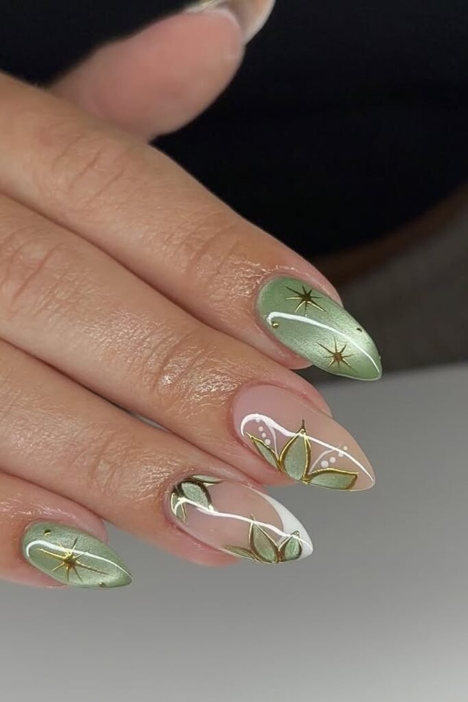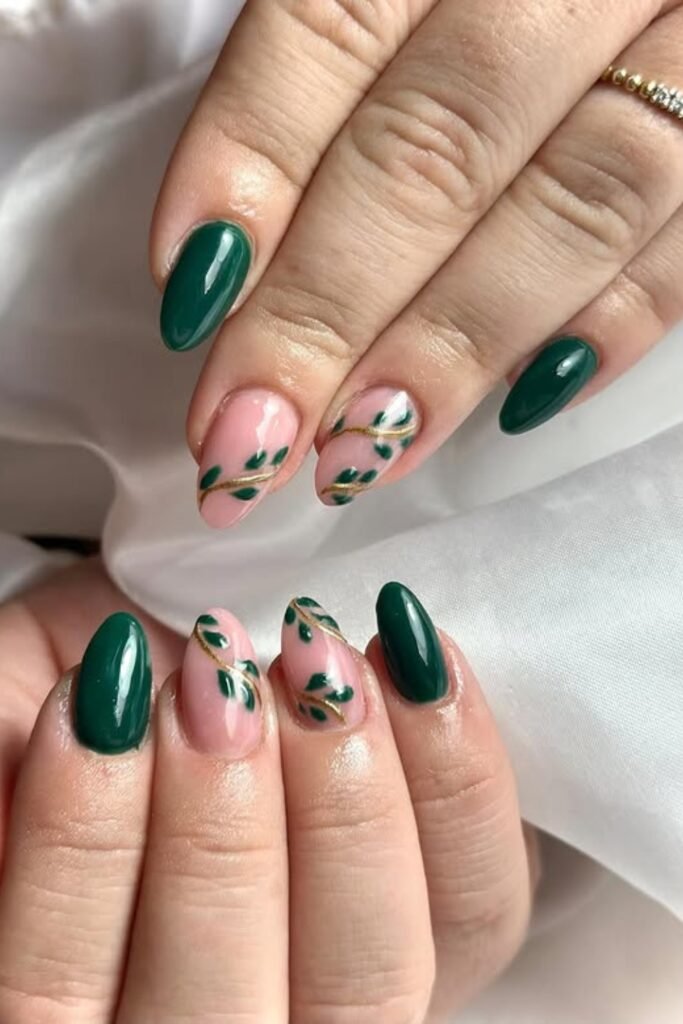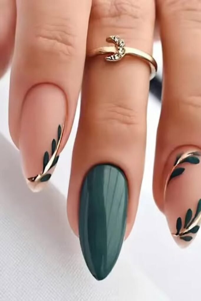 You can make your nails effortlessly elegant with gold-trimmed leaf accents. Keep one nail fully green to add depth and a clean, polished finish.