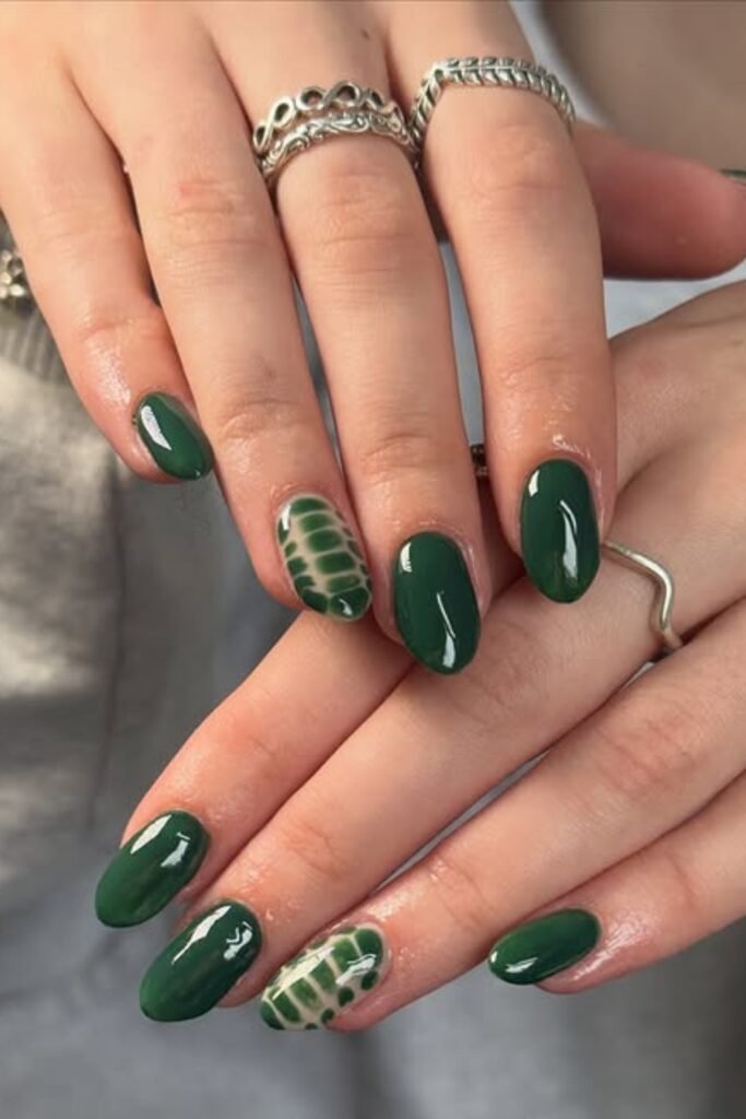 You might notice how the balance between the nude base and dark green gives a modern yet classic feel.