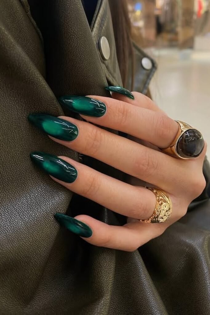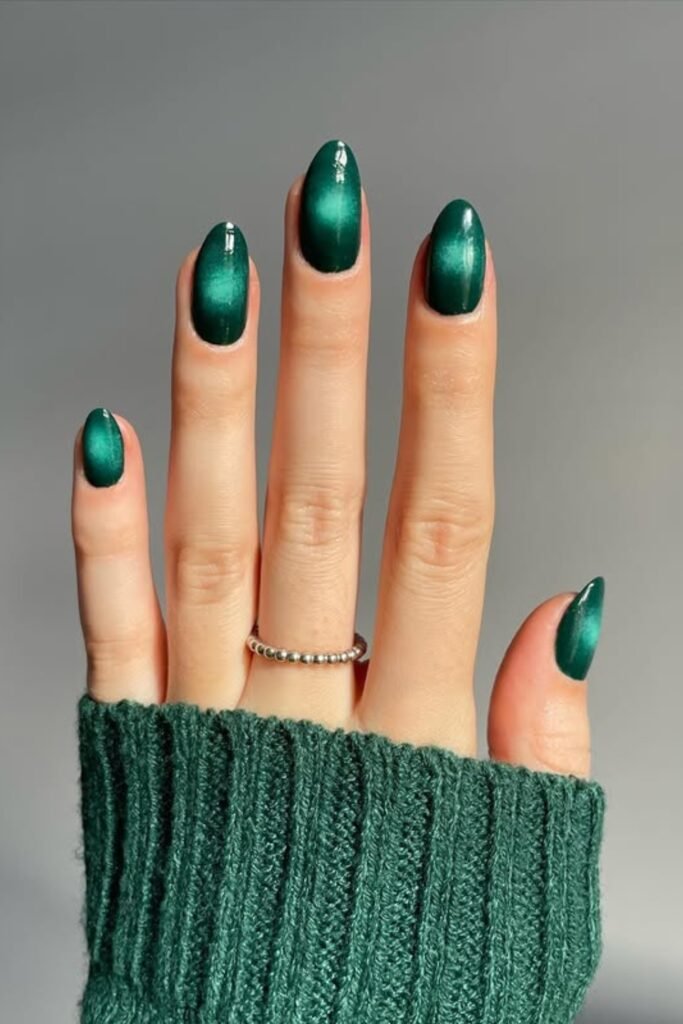 If you go for emerald cat-eye nails, you can enjoy the magnetic shimmer that shifts beautifully with light.