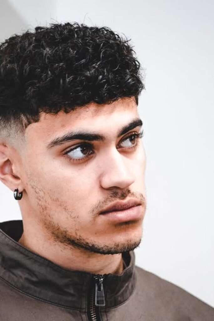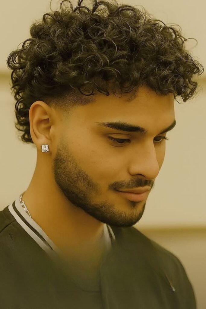 You can ask your barber for a clean temple fade with a soft blend into the sides and enough length on top for the curls to stack naturally.