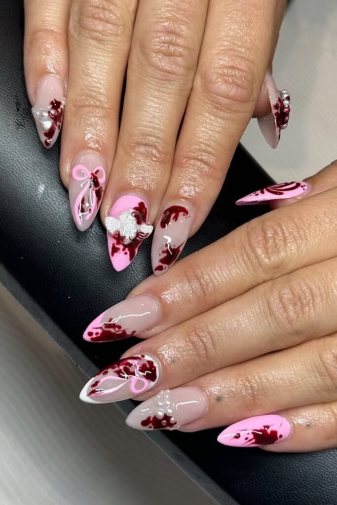 You turn a cute nail design into a bold Halloween statement with a soft pink base and controlled dripping red accents.