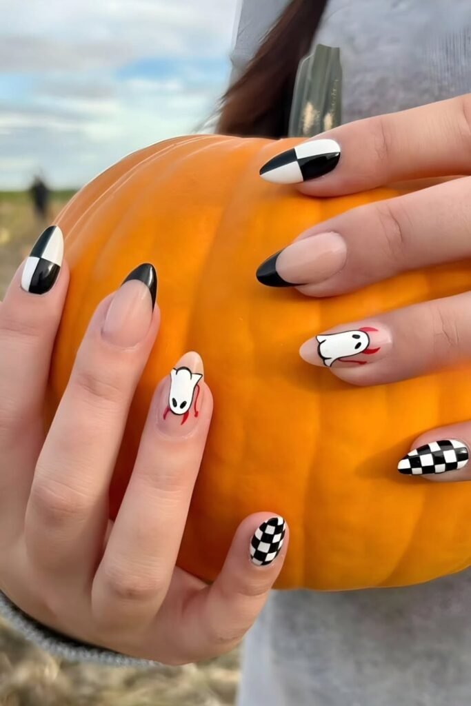 Instead of a plain French tip, you bring life to your nails with a checkerboard pattern and tiny ghost accents.
