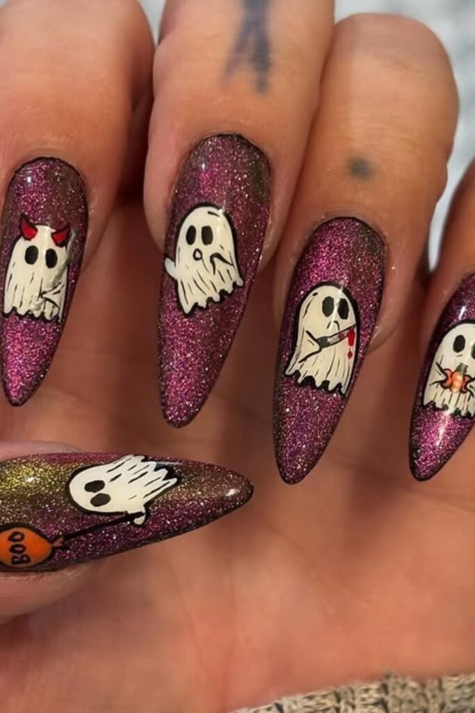 Add sparkle and whimsy by mixing a holographic polish with playful ghost designs on each nail.