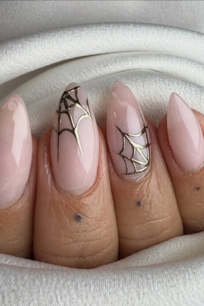 You give your Halloween nails a touch of chic by adding gold spiderwebs over a blush-pink base.