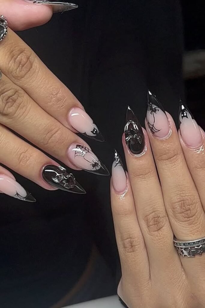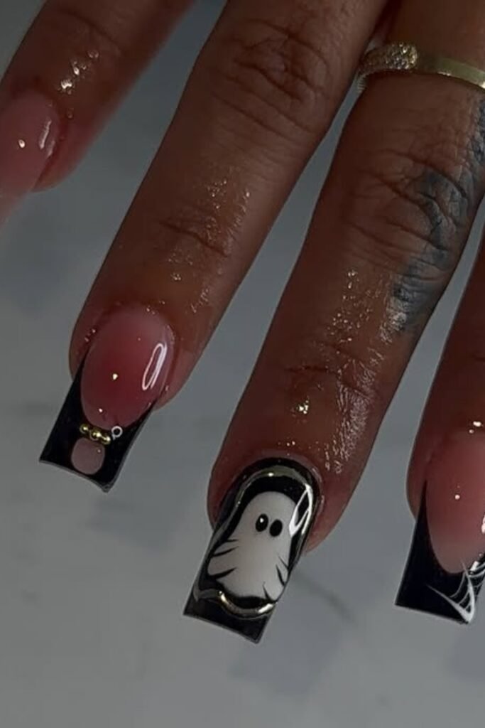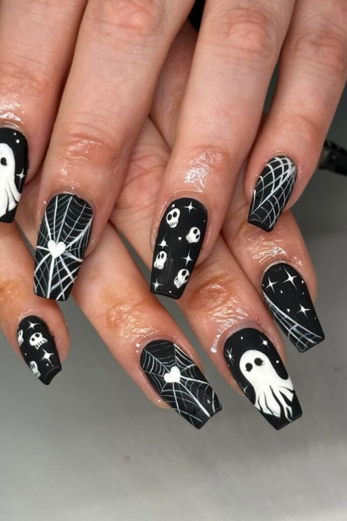 For a bold yet refined vibe, you choose a matte black base and add tiny ghost shapes and spiderweb details.