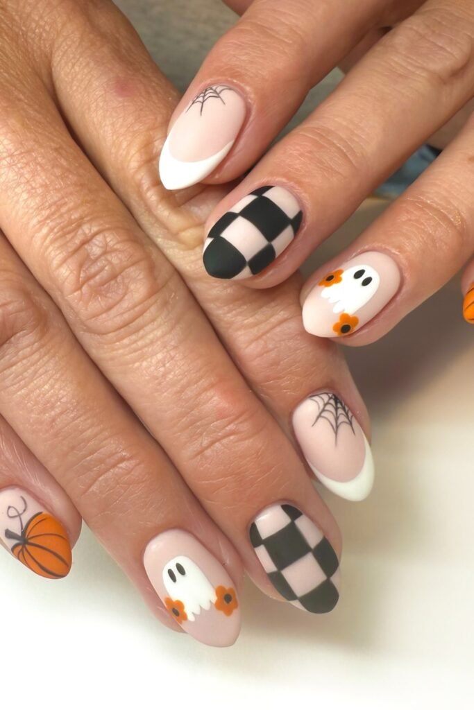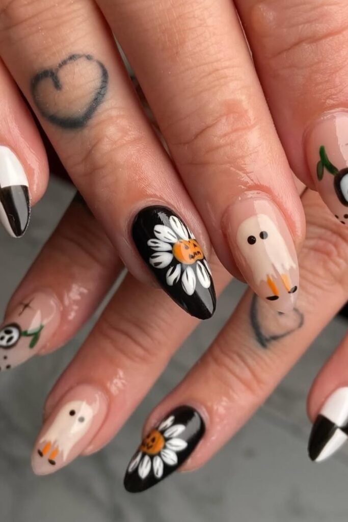 You add cheer to your nails by blending black-and-white checker patterns with pumpkin-faced daisies.