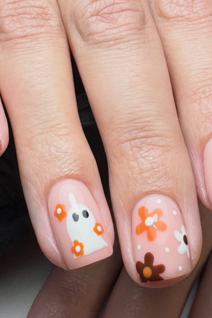 You should celebrate fall by blending warm autumn tones with cute Halloween details like tiny daisies and ghost accents.